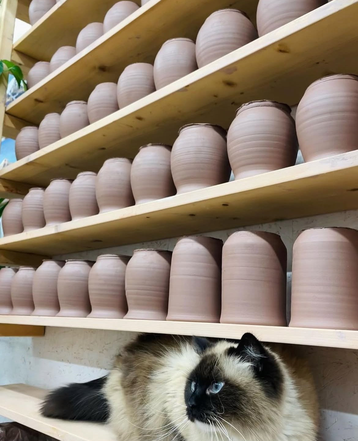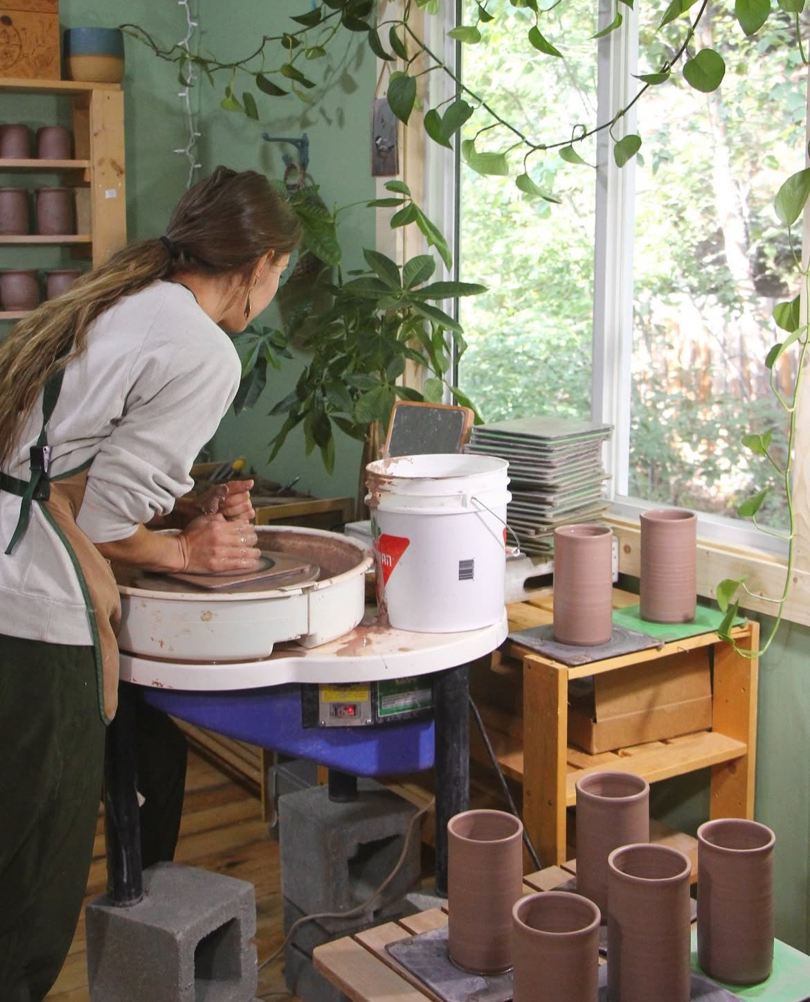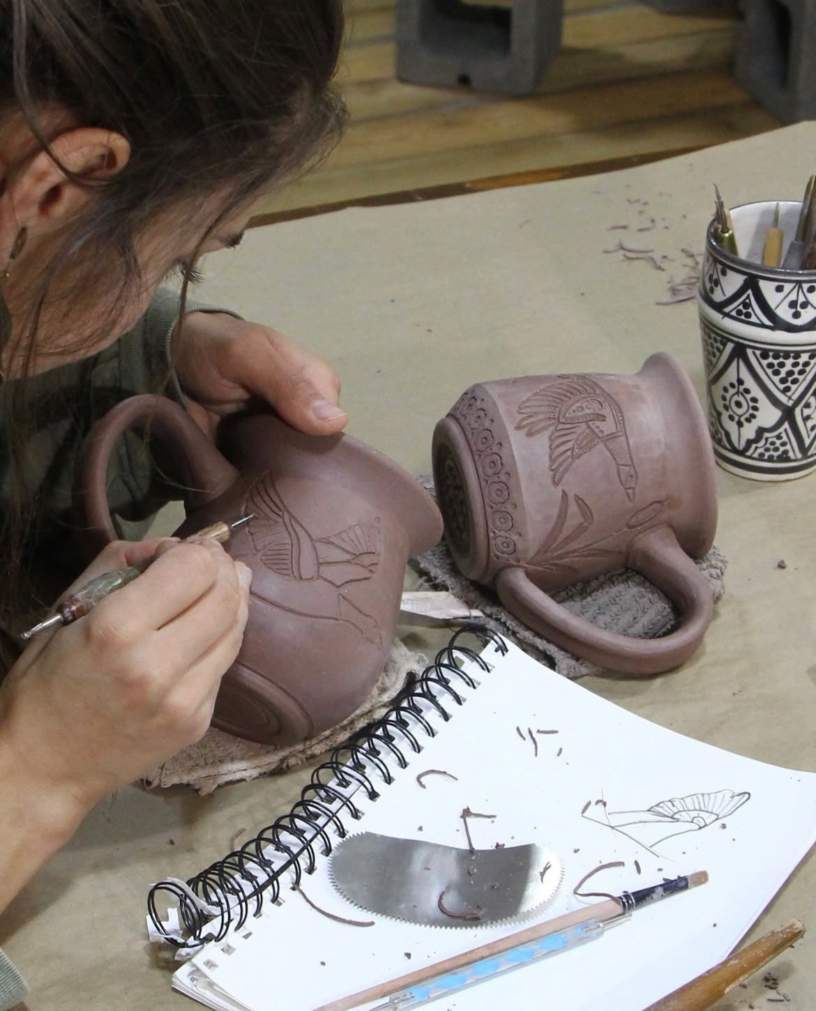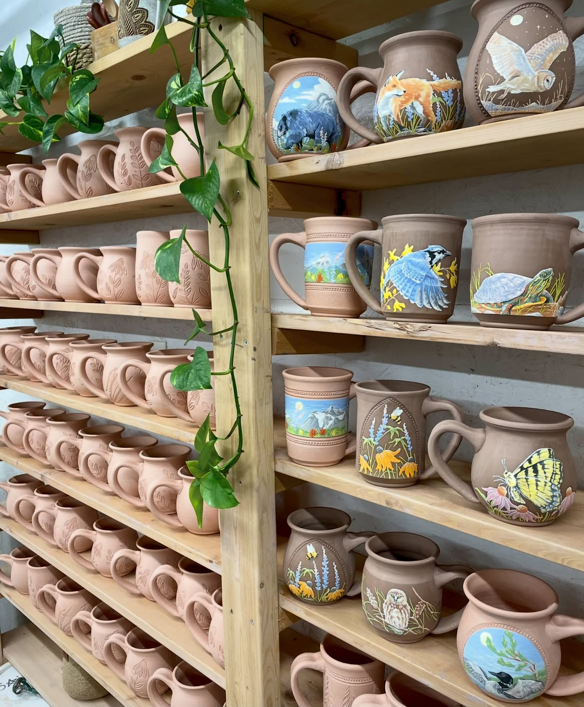All of our pieces start out as a ball of clay and are thrown on a potter's wheel. Once they are dried, trimmed and handled, we create our designs through carving, staining and underglaze painting. The decorated pieces are then fired in our kiln and coated with food-safe, lead-free glazes. They are fired once more to 2200° where they become finished stoneware pieces!