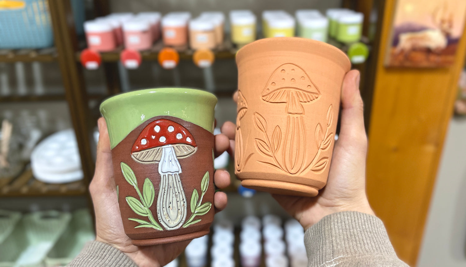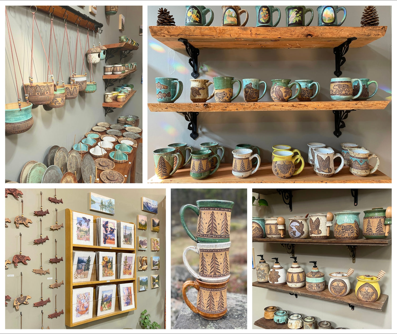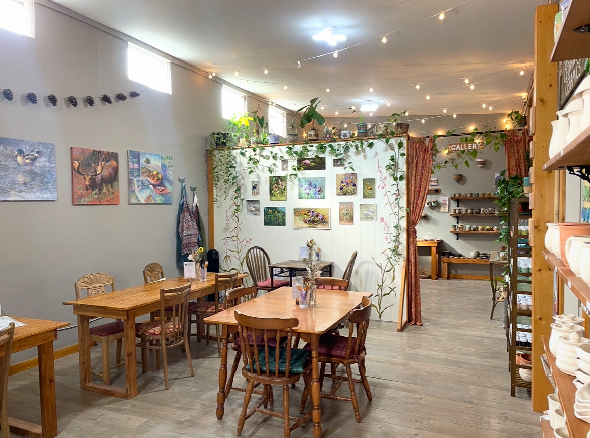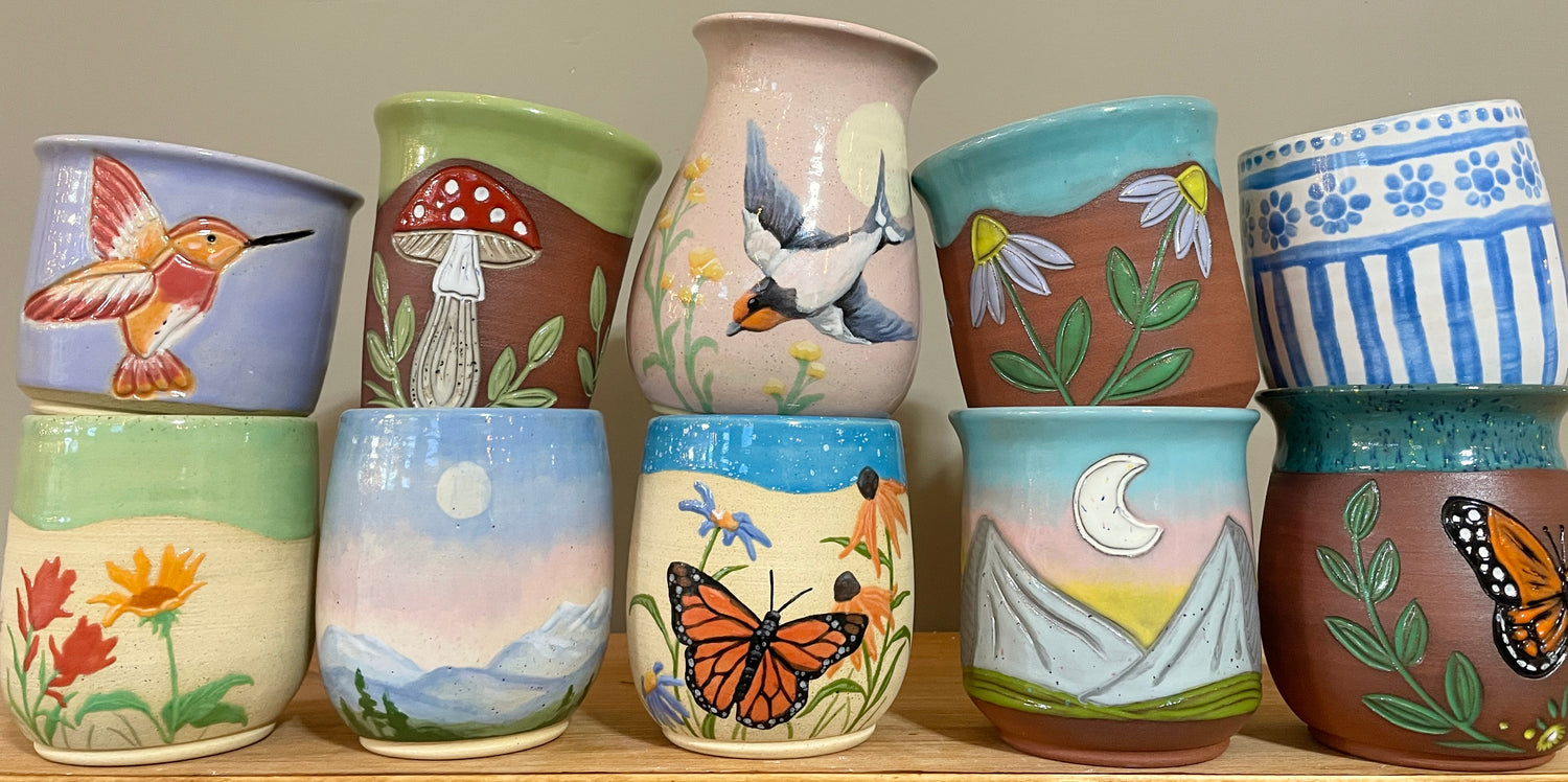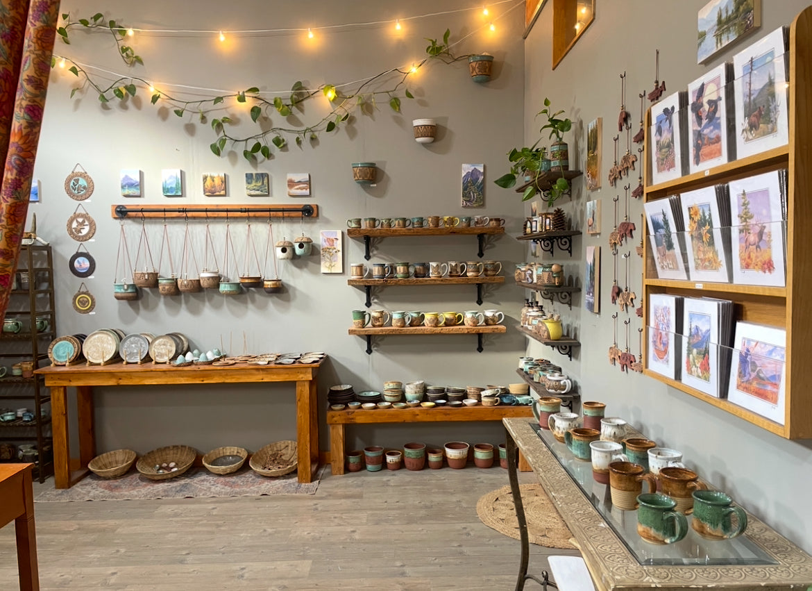 Our gallery is stocked with handmade ceramics by Jenny and a selection of original paintings and prints by Trent. We have ceramic mugs, tumblers, jars, plates, bowls, juicers, incense holders, planters, birdhouses, ornaments and more!